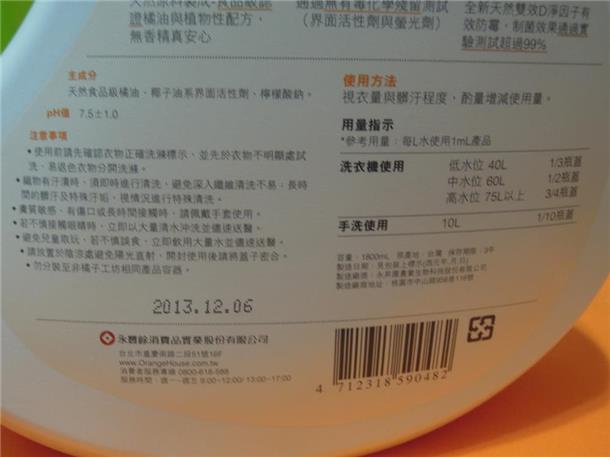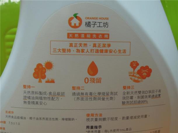 洗衣精倒下去的時候有很濃的橘子味,非常明顯,不過洗完之後就沒有了,基本上就淡淡的,沒什麼味道。